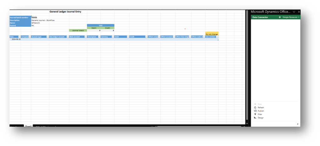 In the form we are interested in, in the upper-right corner, we can see the Excel template that can be used to insert the records. Select the template to open an Excel file that is automatically integrated with D365FO: