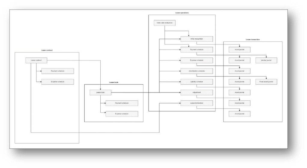 - Lease operations: We can trigger different operations in the lease book, such as initial recognition calculation, payment schedule posting, /etc. Contrary to the book, the lease operations are the actions that we can do in the book to make the planning and the posting;