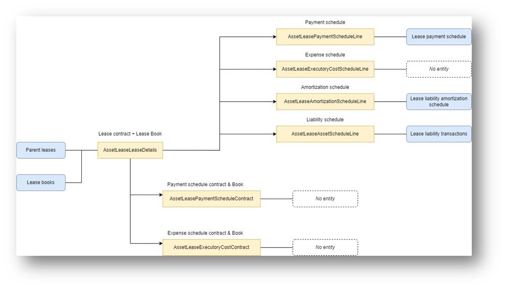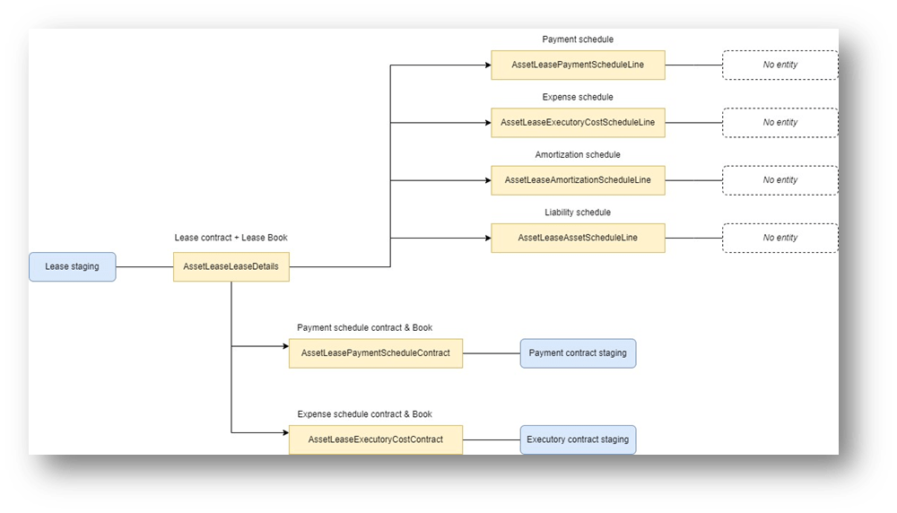 - Direct migration: The lease data can be migrated directly to the related tables (contract, payment schedule, etc.). However, pay attention: not all tables the module uses are part of a data entity. If we want to migrate the data on those tables, we must create a custom data entity.