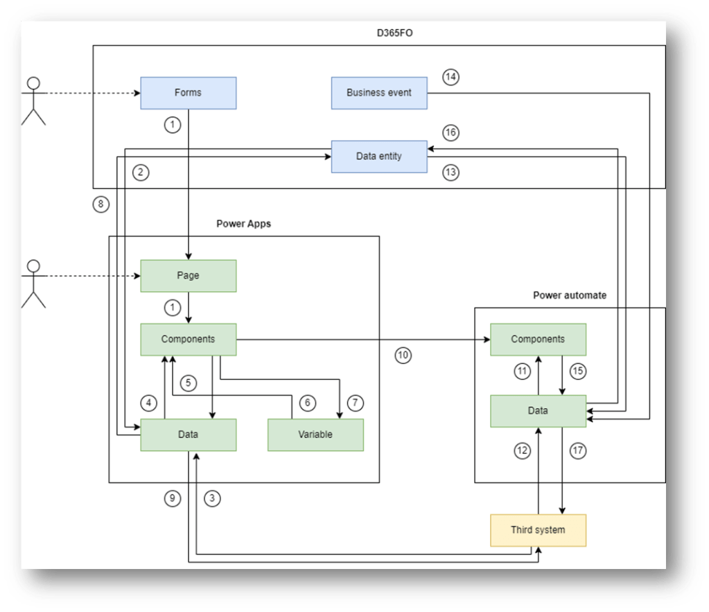 | 9 | Power Apps – Data | D365FO – Third system | Send data from Power Apps to the Third system for creation, updating or deletion. |