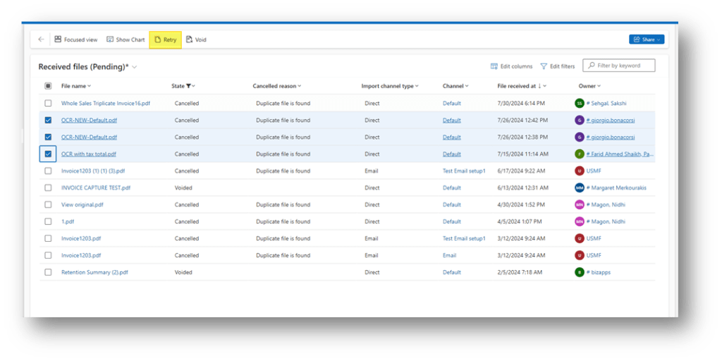 - Retry: If an invoice has the status “cancelled” or “time-out”, we can ask to re-process the invoice. This option allows the multiple selection: