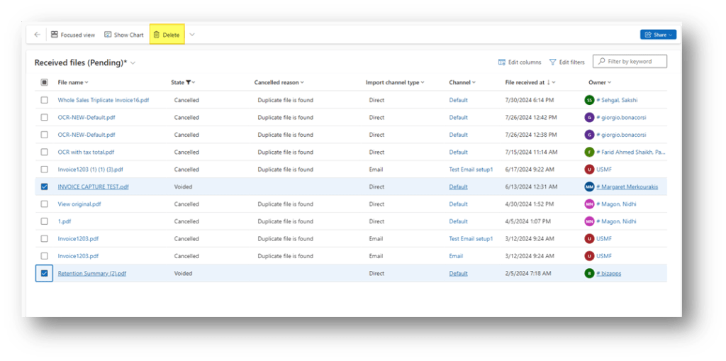 - Delete: for the voided invoice, we can delete the record. This option allows the multiple selection: