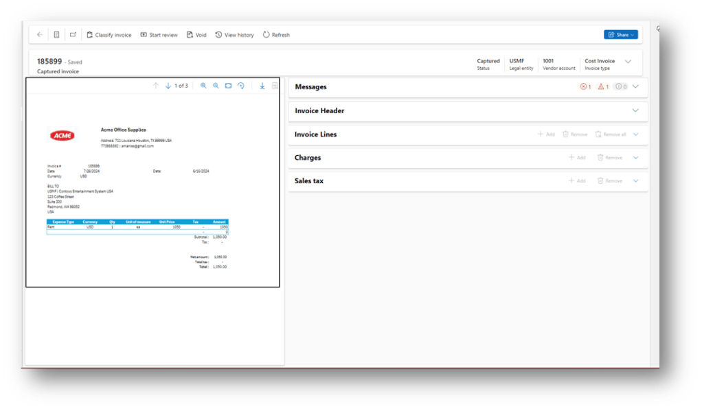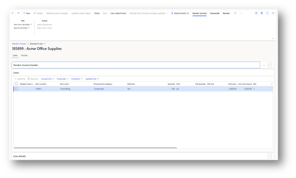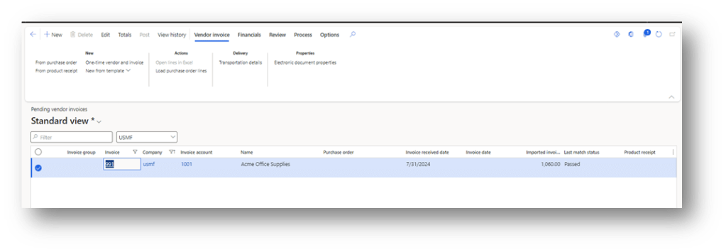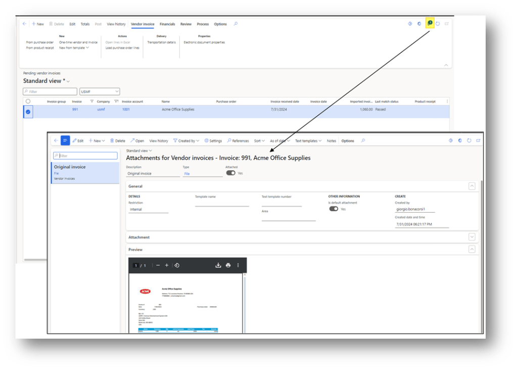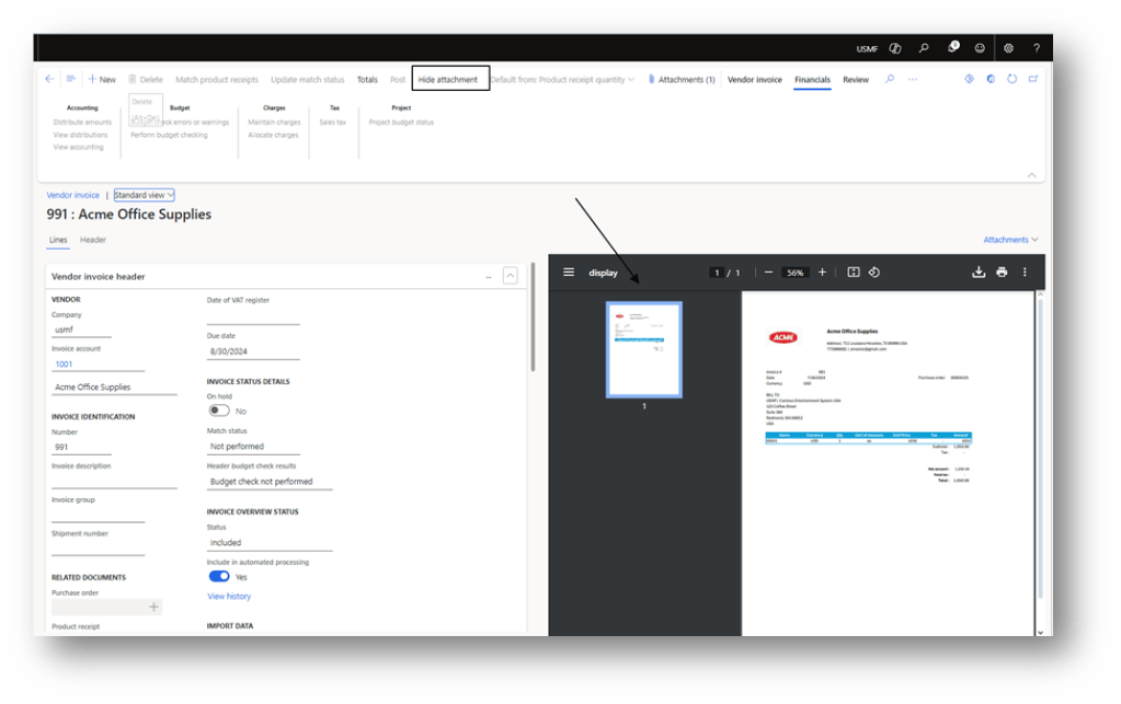 In D365FO, we can have the attachment (for more details about the setup, see the article: https://daxmsdynamics365.wordpress.com/2024/07/29/invoice-capture-enable-parameters-for-invoice-capture/ ). After the reception of the vendor invoice, we can proceed with the regular activities: workflow, matching, validation and post. The only difference is that the document was inserted and pre-matched by the invoice capture, rather than being inserted totally manually: