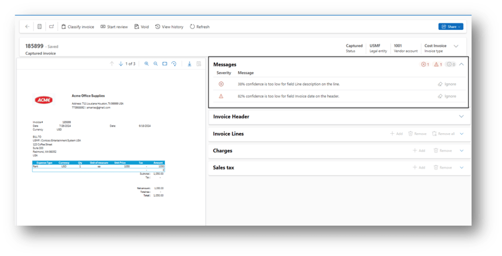 - Messages: Here there are the wanted or error messages. Note that the classifications are based on the confidence score setup on the configuration group (for more details, we can see this article: https://daxmsdynamics365.wordpress.com/2024/07/29/manage-configuration-group/ ):