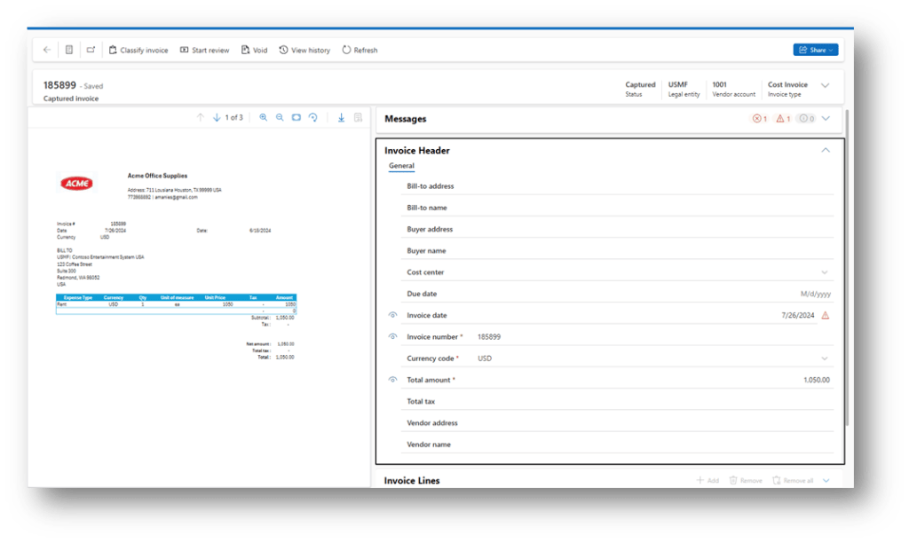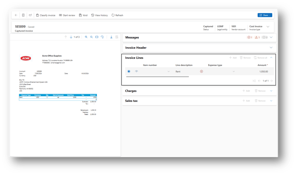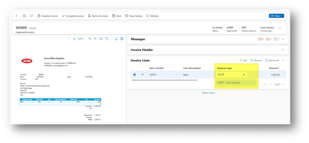 We can also modify the value present in the invoice. Notice, for some fields like expense type (it’s the procurement category for D365FO), the list of the values proposed comes directly from D365FO: