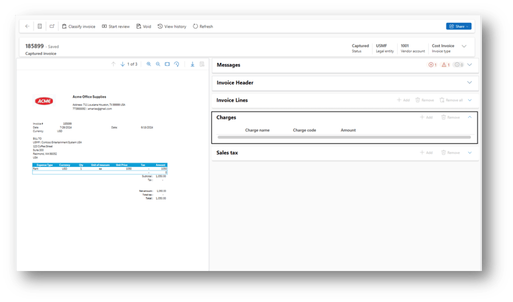 The charge and the sales tax present invoice capture is used to check the total amount. However, it is not part of the transfer; we just transfer the total amount.