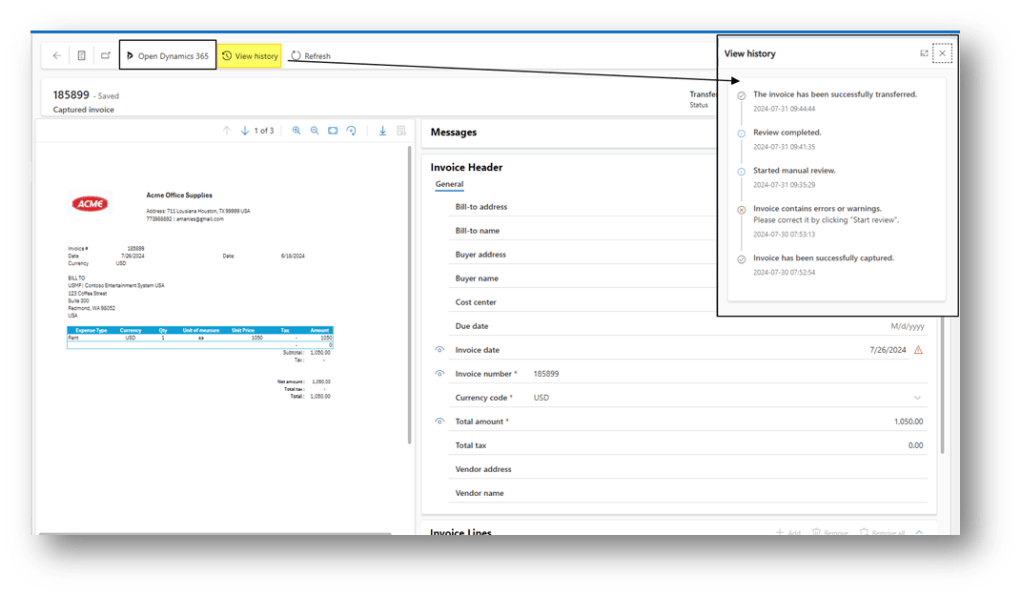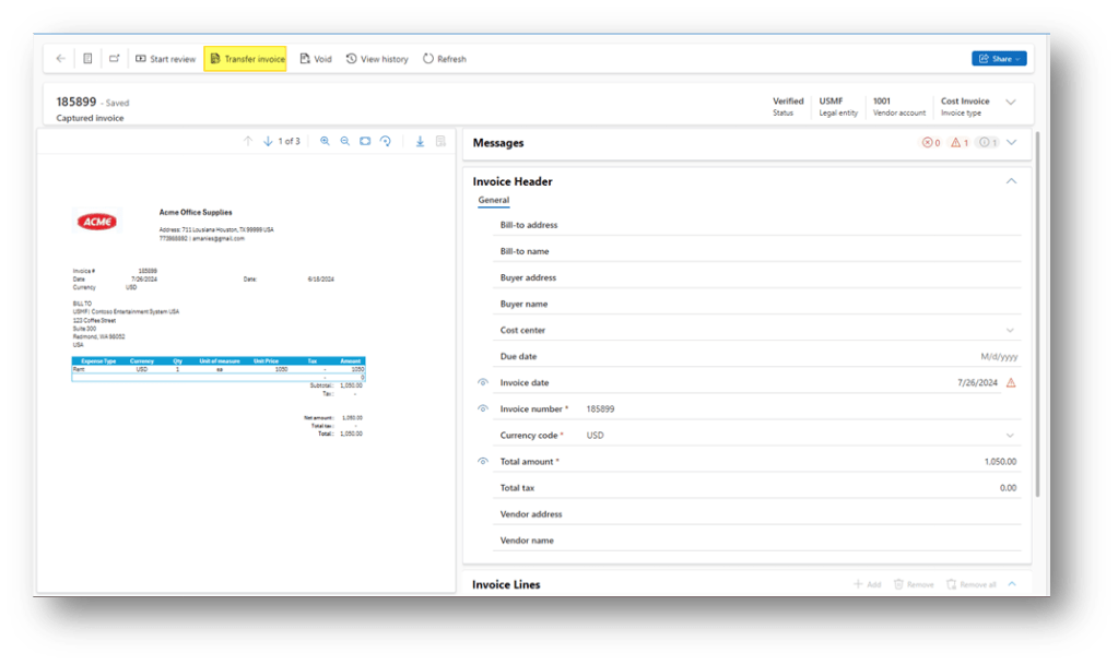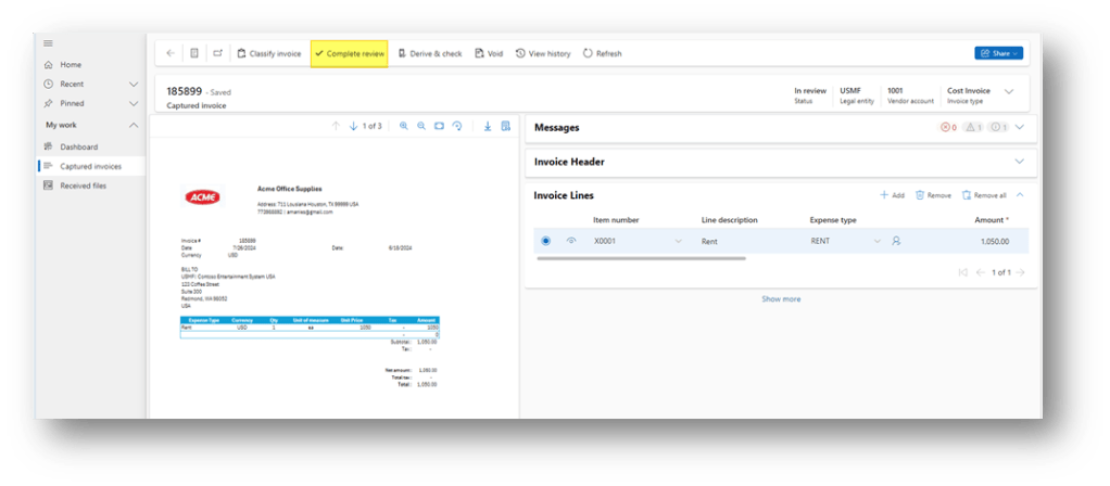 When we finish the review, we can press “Complete review.” Notice that we can restart a new review and complete it as many times as we want until we don’t transfer the invoice to D365FO.