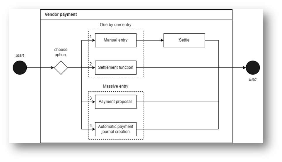 Below, we can find an exposition of our options. Consider that only with the first option (manual entry) the user should post the payment, and then go throughout the vendor/customer master data, and match the invoice involved. While the other options make the payment and the matching in contemporary.