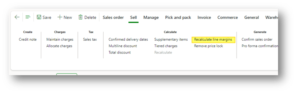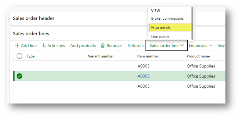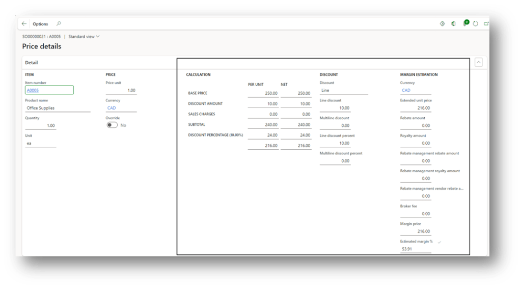 In our sales order line, we can use the function “Price details” to see the variable involved with the margin price: