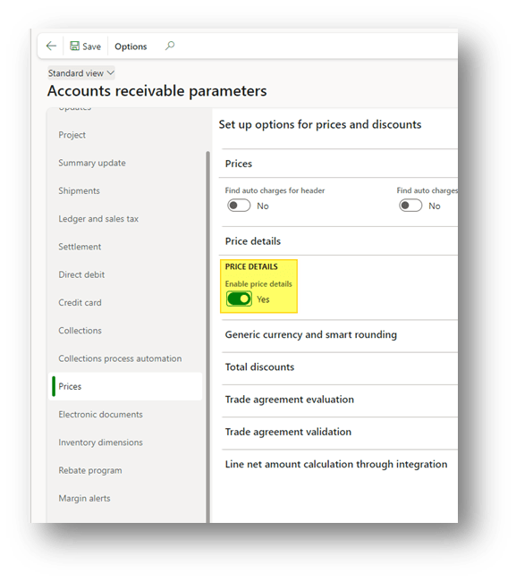 It’s optional, but we suggest activating the “enable price details” over the prices tab. Indeed, D365FO will give us more details about the variable involved in the calculation of the margin: