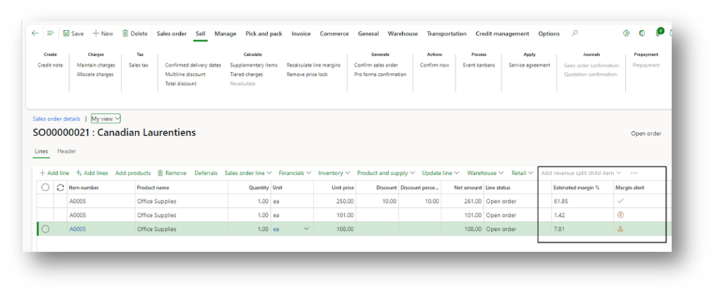 We create a sales order as usual, but we can notice now that at the line level, we have some information about the margin percentage and the feedback of the alert: