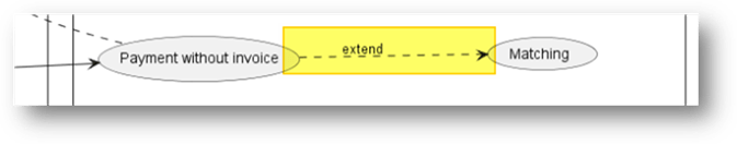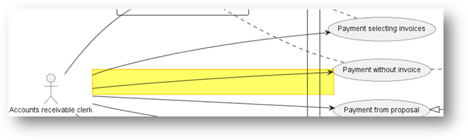 - Association: shows communication between an actor and a case. For example, the “account receivable clerk” triggers “payment without invoices”.