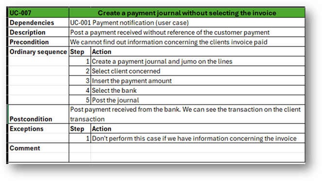 A business case is a user case adapted to a specific business scenario. For example, while a general payment proposal process applies to our client’s payment journal creation, a business case would focus on generating a Bill of Exchange proposal for the Royal Bank of Canada. In short, business cases are cases for specific business situations.