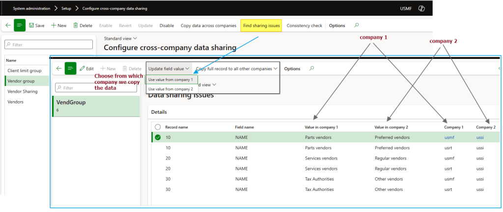 During the sharing (before or after the coping of the data), we can solve the conflict by pressing on “find sharing issue”. From this form we can see all the sharing issues and decide case by case, and we can choose from which company we want to copy the data from. Concerning the record in conflict, we must decide if to update only the conflicted field or copy all the record’s field touched by the cross-company function to the target entity.