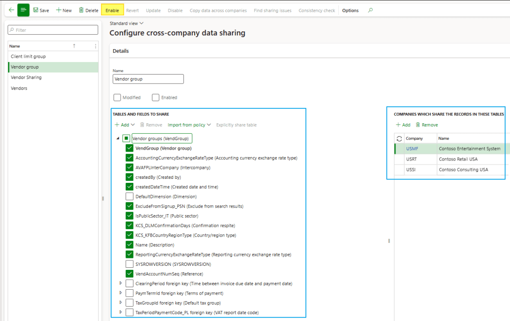 Choose the fields to share across companies and retain the fields that should remain specific to each legal entity. We can decide whether to share the fields for all legal entities or only for specific ones. When we finish, we publish the policy pressing on the button “Enable”: