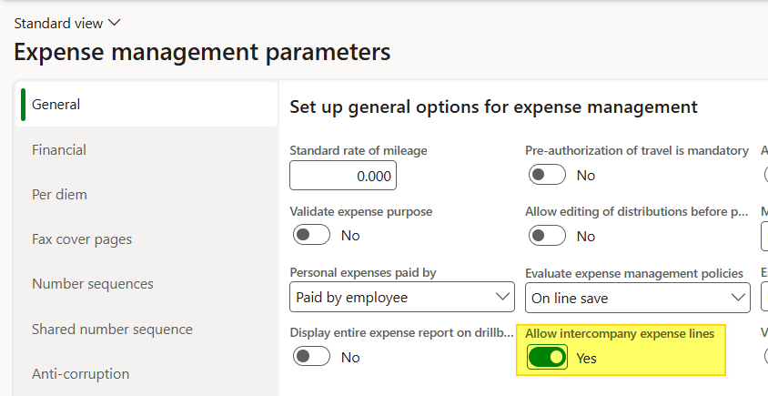 Go to: Expense management> Setup> General> Expense management parameters. Select the flag “Allow intercompany expense line.