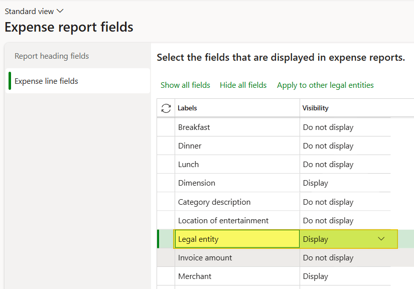 Go to: Expense management > Setup > General > Expense report fields. On the header, activate the display for the field “Legal entity for expenses”.