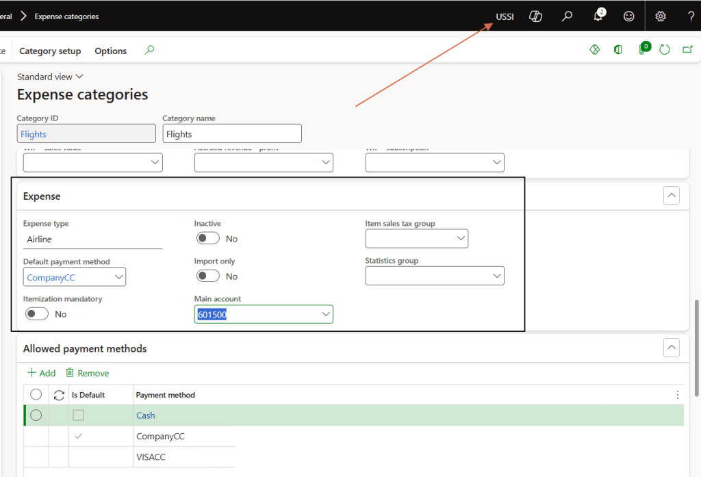 Go to: Expense management > Setup > General > Expense categories. We will record our expense in USMF; however, remember that the cost should be absorbed by our third legal entity (USSI in this case). Thus, the expense categories should be released even in this legal entity.