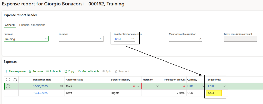 The process is exactly the same as for a regular expense report, except users need to specify the legal entity. And right there on the line level, we’ve got to tag which one’s actually footing the legal entity.
