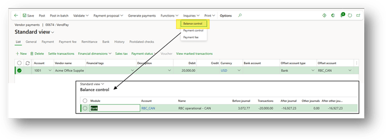 When you enter a payment in the journal, we can see before the posting the bank balance: