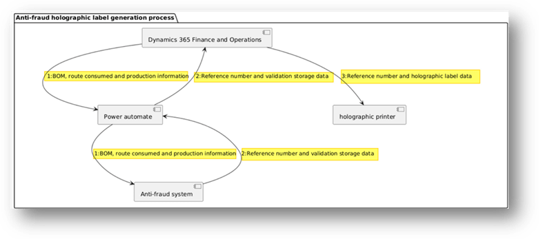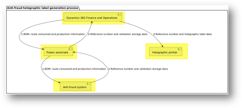 Let’s look at an example. We are producing items, and for the anti-counterfeiting, certification, we need to add a label to our products. The certification number on this label is obtained from a specific API service. We use this reference number to store related product data (such as BOM, production site, etc.) into a dedicate website consultable from our end-customer. During production, D365FO should trigger a special printer to print the certification label on specialized holographic paper, incorporating the reference number.