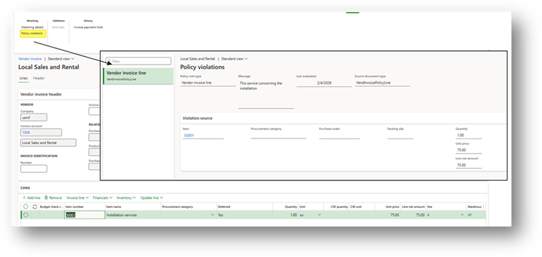 It is possible to calculate, when entering a pending invoice, whether the document satisfies certain policy requirements. If violations are detected, the system displays an informational message to notify the user whether the document complies with a specific policy or not.