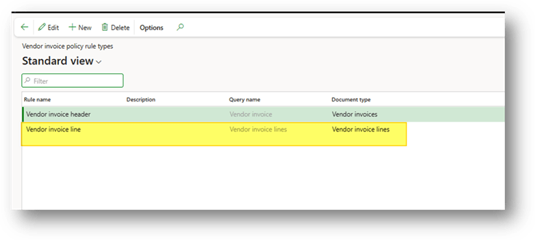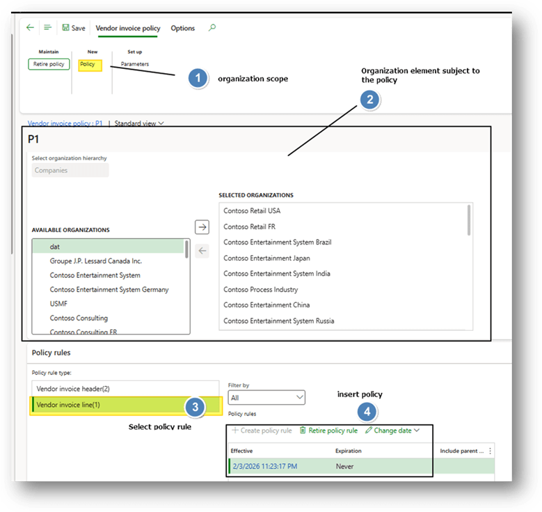 Create a vendor invoice policy. Select the vendor invoice rules names previously configured and set the criteria to trigger the rules.