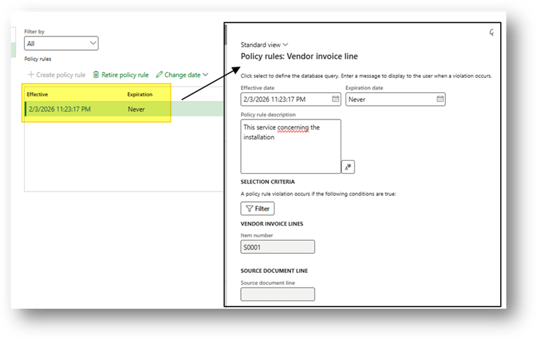 When we insert the invoice, the system calculates the policy violations during the saving process. If there are any violations, D365FO displays a confirmation message.