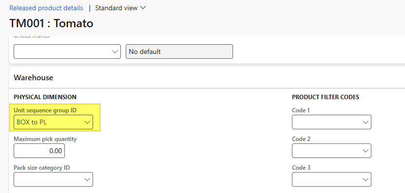 - Unit sequence group ID: the different unit of measure involved (each, box, pallet, etc..), the conversion between them and the unit used into the different process