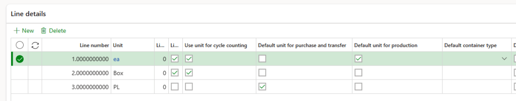 This configuration exactly defines the unit of measure and conversions involved into our process. Moreover, we configure here even the warehouse policies for each unit of measure. For example, when we produce we want to thinks at each package level, but when we purchase at pallet level.