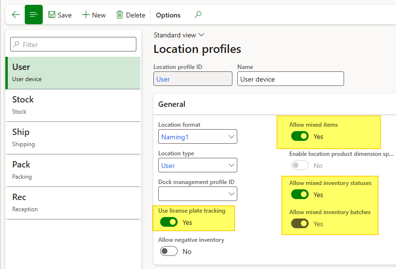 | Id | Use license plate tracking | Allow mixed items | Allow mixed inventory status | Allow mixed batches |