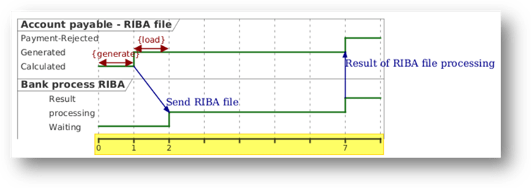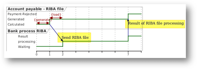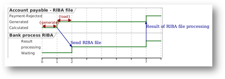 @startumlrobust "Account payable - RIBA file" as D365FOrobust "Bank process RIBA" as BANK' Duration constraints D365FO@0 <-> @1 : {generate}D365FO@1 <-> @2 : {load}' ComunicationD365FO@1 -> BANK@2 : Send RIBA fileBANK@7 -> D365FO@7: Result of RIBA file processing' Status change@0D365FO is CalculatedBANK is Waiting @1D365FO is Generated @2BANK is processing@7D365FO is Payment-Rejected BANK is Result @enduml