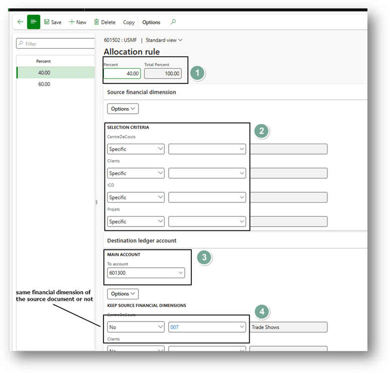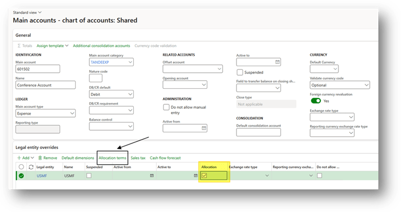 Select your main account, add the legal entity where the system should run the allocation and check the mark “allocation”. Then select “allocation terms” to configuration the rules: