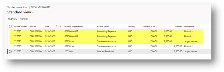 Post a general journal entry as usual, using the main account previously configured for allocation.