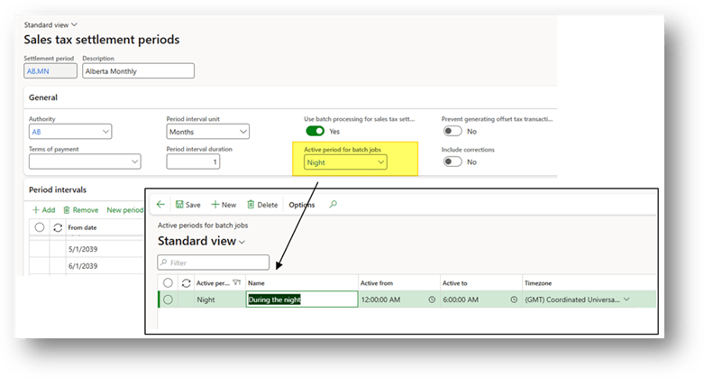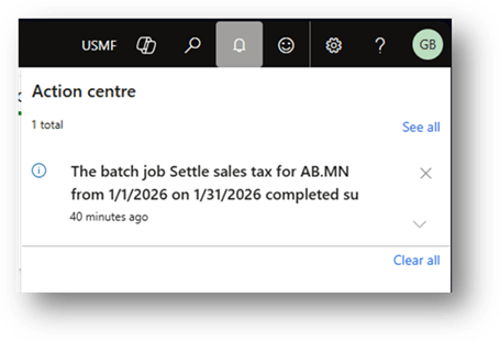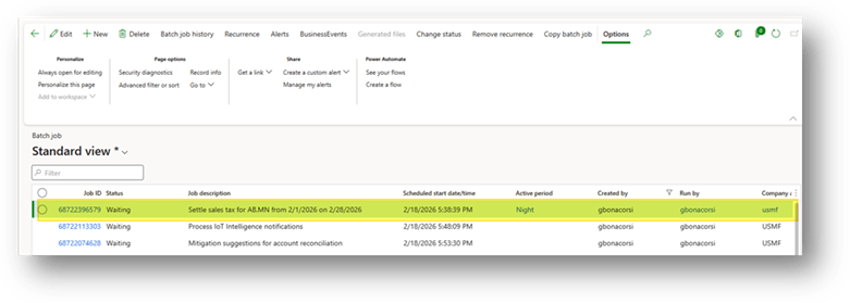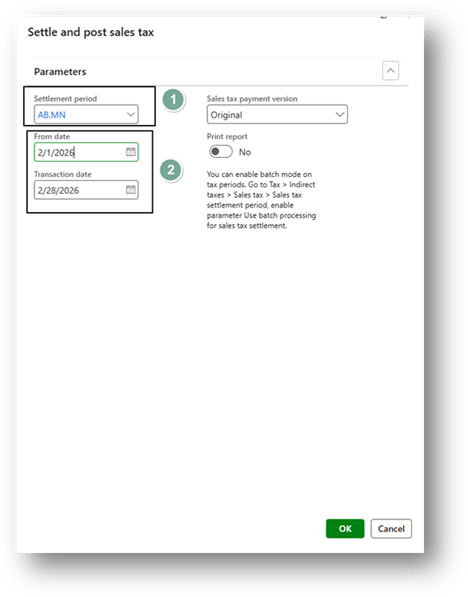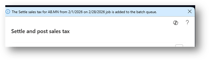 Select the settlement period and check the “Use batch processing for sales tax settlement” flag to indicate in D365FO that this settlement should be run as a batch: