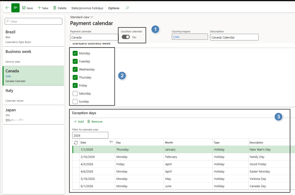 - Payment calendar: Defines working days and holidays.