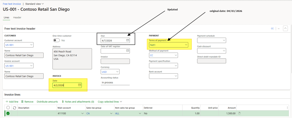 Process the invoicing as usual. When the system identifies a non-working day, it automatically updates the due date according to the rule defined in the payment payment calendar and payment terms.