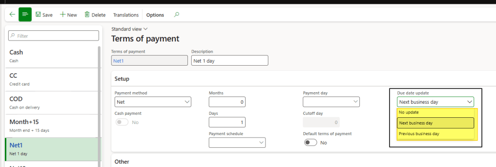- Payment terms: Rules for handling non-working days (move the due date before or forward).