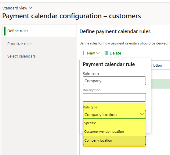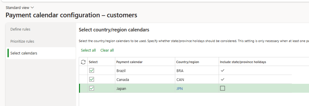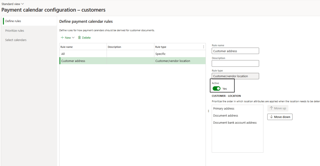 Order of rules when creating a new invoice. The system applies the rules in this priority order if the criteria match the invoice. In your case if the customer has no address (on the document or in the bank details), the same business calendar applies to all combinations of payment methods and terms.